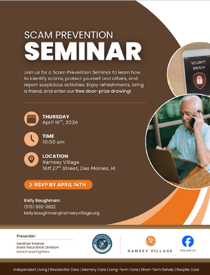 Join us for a Scam Prevention Seminar to learn how to identify scams, protect yourself and others, and report suspicious activities. Enjoy refreshments, bring a friend, and enter a free door-prize drawing!